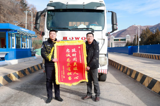 1月8日上午,在第五个中国人民警察节来临之际,吉林三合出入境边防检查站收到一件特别的“礼物”。通关货车司机张义忠带着印有“延时闭关暖人心 忠诚为民有担当”的锦旗送到口岸正在执勤的民警手中,对该站民警长期以来在口岸执勤中保障通关、为企解忧、为民办事方面提供的优质服务表示衷心感谢。